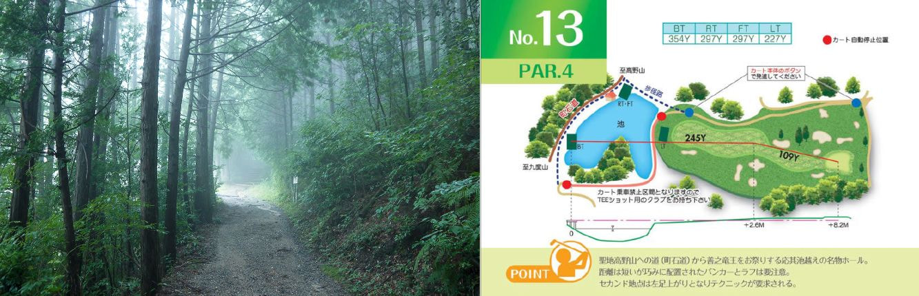 コース上から高野山を望むことができる標高500mの高原に広がる丘陵コース。戦略性の高いレイアウトに高原ならではといえる春夏秋冬の変化が楽しめる、ゴルファーを飽きさせないコース。また、高野山への参詣道・町石道がコース内にあるのも特徴的。冬季も青々とした色合いを保つ高速ベントグリーンやカート道にも芝をひくなど、ひと手間かけた気遣いとノンストレス移動を可能にした多機能ナビ付きカートの設置などホスピタリティの高さも魅力といえます
